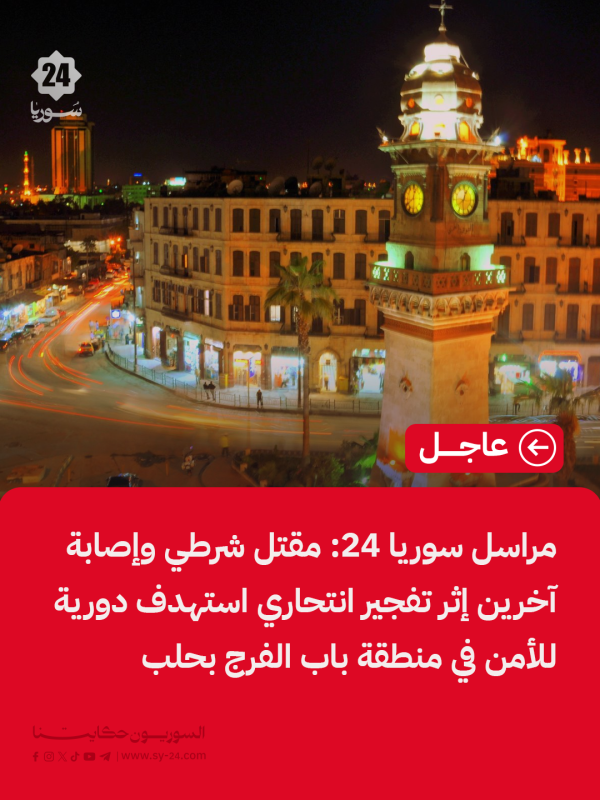 مقتل شرطي وإصابة آخرين إثر تفجير انتحاري استهدف دورية للأمن في منطقة باب الفرج بحلب