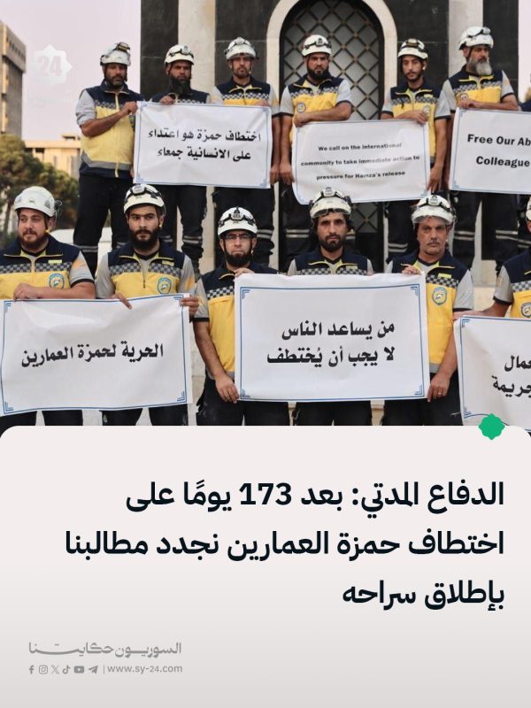 يطالب الدفاع المدني السوري بالإفراج الفوري وغير المشروط عن المتطوع حمزة العمارين.