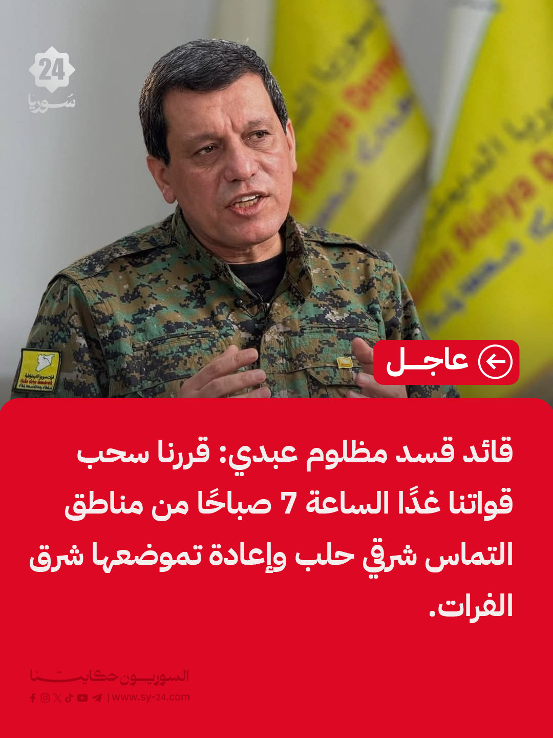 قائد قسد مظلوم عبدي: قررنا سحب قواتنا غدًا الساعة 7 صباحًا من مناطق التماس شرقي حلب وإعادة تموضعها شرق الفرات.