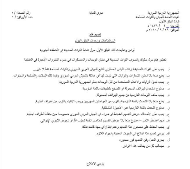 وصدرت الوثيقة في سبتمبر/أيلول 2018، عن “قيادة الفيلق الأول في القيادة العامة للجيش والقوات المسلحة”، وموضعها “أوامر وتعليمات حول نشاطات القوات الصديقة في المنطقة الجنوبية”.