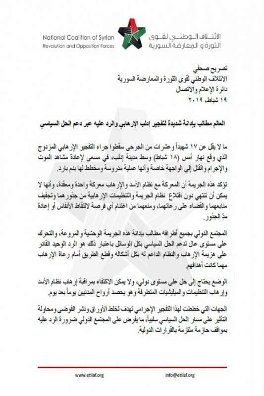 اتهم الائتلاف الوطني لقوى الثورة السورية، النظام بالوقوف وراء “العمل الإرهابي” الذي وقع في مدينة إدلب، يوم الاثنين الماضي، وطالب المجتمع الدولي بإدانة التفجير المزدوج.