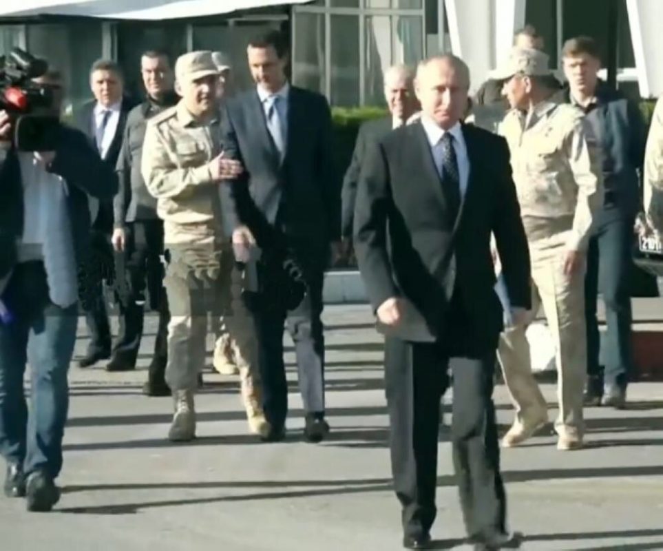 وأظهرت الصورة التي نشرتها قناة الجزيرة في برنامج ما وراء الخبر، تواجد بشار الأسد بجانب الحرس الجمهوري الخاص المكلف بحماية الرئيس الروسي فلاديمير بوتين، أثناء إلقاء كلمة له في قاعدة حميميم بمحافظة اللاذقية.