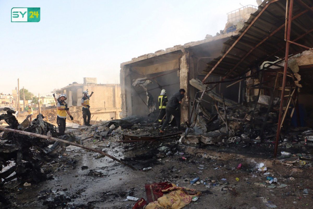 وأكد مراسل SY24 أن 5 مدنيين (3 أطفال وفتاة في عمر التاسعة عشر وامرأة) قُتلوا وأصيب ما يزيد عن 8 آخرين بجروح بينهم 4 أطفال جراء غارات جوية طالت 3 أحياء سكنية في المدينة، فضلاً عن الدمار الهائل الذي خلّفه القصف.