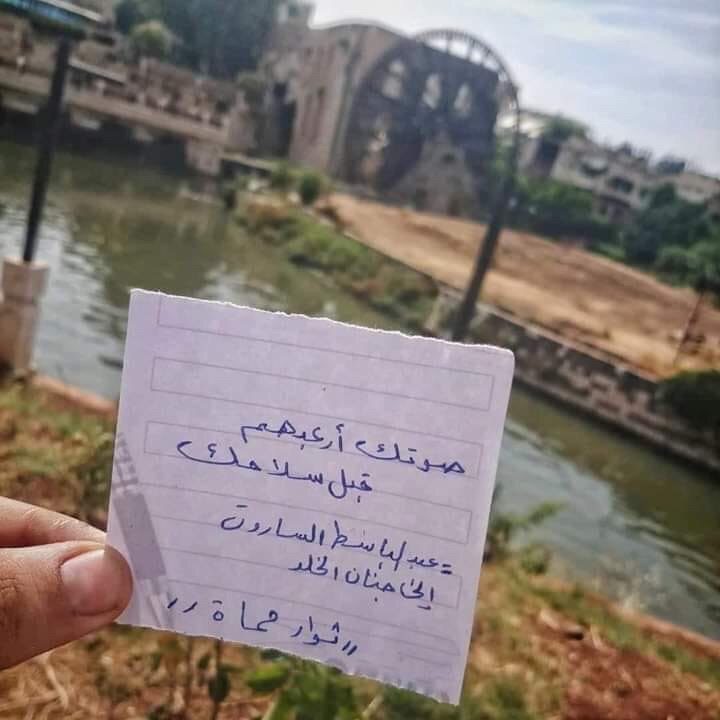 وكتب في الورقة التي ظهرت في الصورة: “صوتك أرعبهم قبل سلاحك.. عبد الباسط ساروت إلى جنان الخلد”، كما حملت الورقة توقيع “ثوار حماة”.