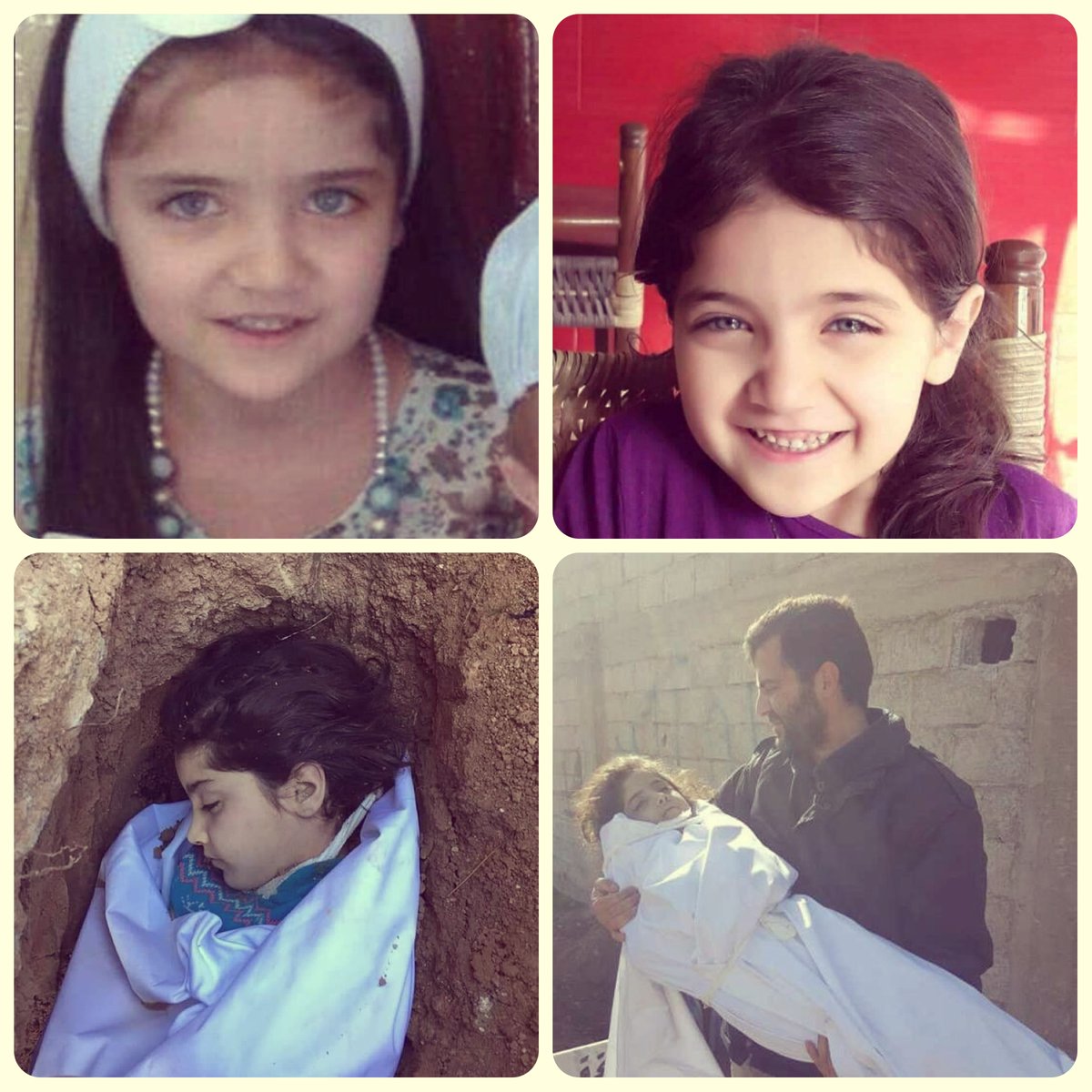 فقد انتشرت صورة حلا المدني، التي قضت الجمعة بغارة جوية للنظام السوري في بلدة بيت سوى بالغوطة، على مواقع التواصل، مترافقة بسؤال وحيد: “أي تراب غطى وجهك؟ وأي ظلم وقهر هذا الذي يخطف الأطفال من الأحضان؟”.