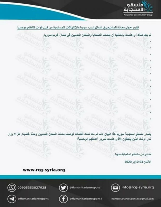 وأوضح أن البيان الفارغ الذي لم يتضمن أي تفاصيل، أن منسقو الاستجابة يصدر هذا البيان لأننا لم نعد نملك الكلمات لوصف معاناة السكان المدنيين وحدة غضبنا”.
