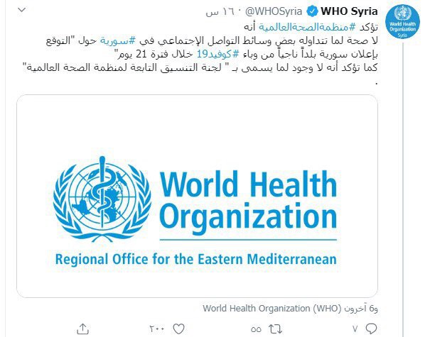 وذكرت الصحة العالمية في بيان على حسابها في “تويتر” والخاص بسوريا، أن “منظمة الصحة العالمية تؤكد أنه لا صحة لما تتداوله بعض وسائل التواصل الاجتماعي في سورية حول التوقع بإعلان سورية بلداً ناجياً من وباء كورونا خلال فترة 21 يوم”.