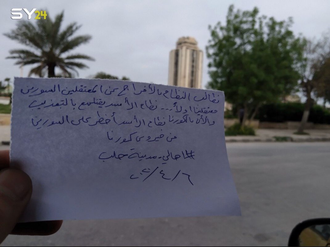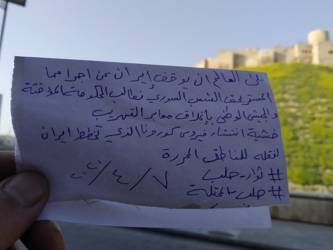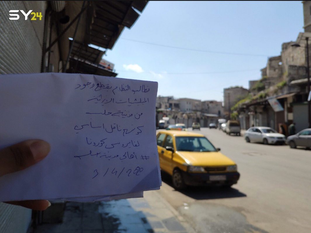 وتضمنت المناشير الورقية عدة عبارات متعلقة بالميليشيات الإيرانية، ومنها: “نطالب النظام بإنهاء وجود الميليشيات الإيرانية في مدينة حلب، كونهم ناقل أساسي لفيروس كورونا”.