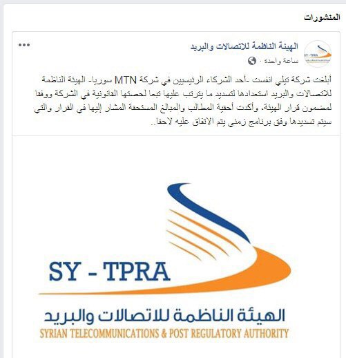 ونشرت جريدة “الوطن” الموالية للأسد والمملوكة أصلا لـ “مخلوف” أن “شركة تيلي انفست -أحد الشركاء الرئيسيين في شركة MTN سوريا- أبلغت الهيئة الناظمة للاتصالات والبريد، استعدادها لتسديد ما يترتب عليها تبعا لحصتها القانونية في الشركة ووفقا لمضمون قرار الهيئة، وأكدت أحقية المطالب والمبالغ المستحقة المشار إليها في القرار والتي سيتم تسديدها وفق برنامج زمني يتم الاتفاق عليه لاحقاً”.