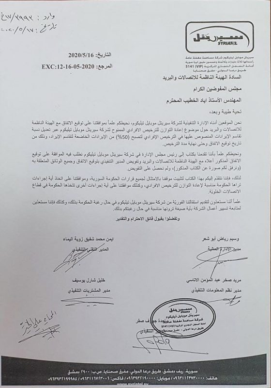 وأرفقت الهيئة في بيانها صورة عن الوثيقة الموقع عليها من “الإدارة التنفيذية لشركة سيريتل”، والتي يظهر فيها أنهم تقدموا بطلب لـ “رامي مخلوف” لمنحهم التفويض اللازم لتوقيع الاتفاق مع الهيئة و”القاضي بإعادة التوازن للترخيص الإفرادي الممنوح لشركة سيريتل، عبر تعديل نسبة تقاسم الإيرادات المنصوص عليها في الترخيص الإفرادي لتصبح 50% من الإيرادات الخاضعة لتقاسم الإيراد، وذلك من تاريخ توقيع الاتفاق وحتى نهاية مدة الترخيص”، إلا أن “مخلوف” رفض منحهم التفويض للتوقيع حسب ما جاء في البيان.