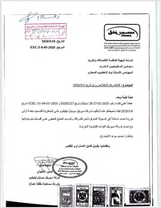وقال “مخلوف” في منشور على صفحته في “فيسبوك”، إنه “جواباً على ما نشرته الهيئة الناظمة للاتصالات والبريد على صفحتها الرسمية على موقع التواصل الاجتماعي فيسبوك، حول رفض شركة سيريتل موبايل تيليكوم دفع المبالغ المفروضة عليها، فإننا نبين عدم صحة ما جاء بهذا المنشور، كون شركة سيريتل قد توجهت للهيئة الناظمة للاتصالات والبريد بالكتاب المرفق صورته ربطاً الذي تم تسجيله في ديوان الهيئة تحت الرقم 4777/ح.ن.ق بتاريخ 10/05/2020 والذي بينت شركة سيريتل بموجبه استعدادها لتسديد المبالغ المفروضة عليها ومطالبةً الهيئة الناظمة للاتصالات والبريد بموجبه تحديد مبلغ الدفعة الأولى ومبالغ الأقساط الأخرى والفوائد المترتبة عليها”.