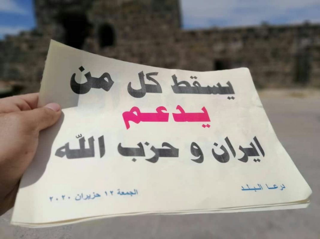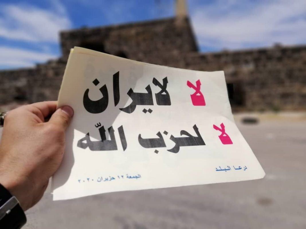 ورفع المشاركون في الحملة عدة شعارات من بينها: “يسقط كل من يدعم إيران وحزب الله.. لا للتدخل الإيراني في الجنوب السوري.. لا لإيران لا لحزب الله”.