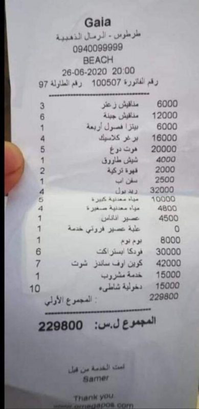 نشرت صفحات موالية للنظام فاتورة من أحد المطاعم في منتجع “الرمال الذهبية” في طرطوس، مشيرة إلى أنها تعادل رواتب 5 موظفين في ظل الانهيار الاقتصادي الذي تشهده سوريا.
