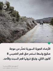 الأرصاد الجوية السورية تحذّر من موجة صقيع واسعة تستمر حتى فجر الخميس 8 كانون الثاني، وتبلغ ذروتها فجر السبت والأحد.