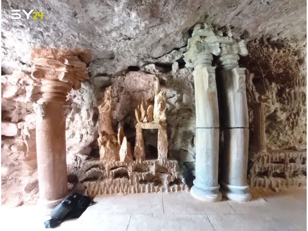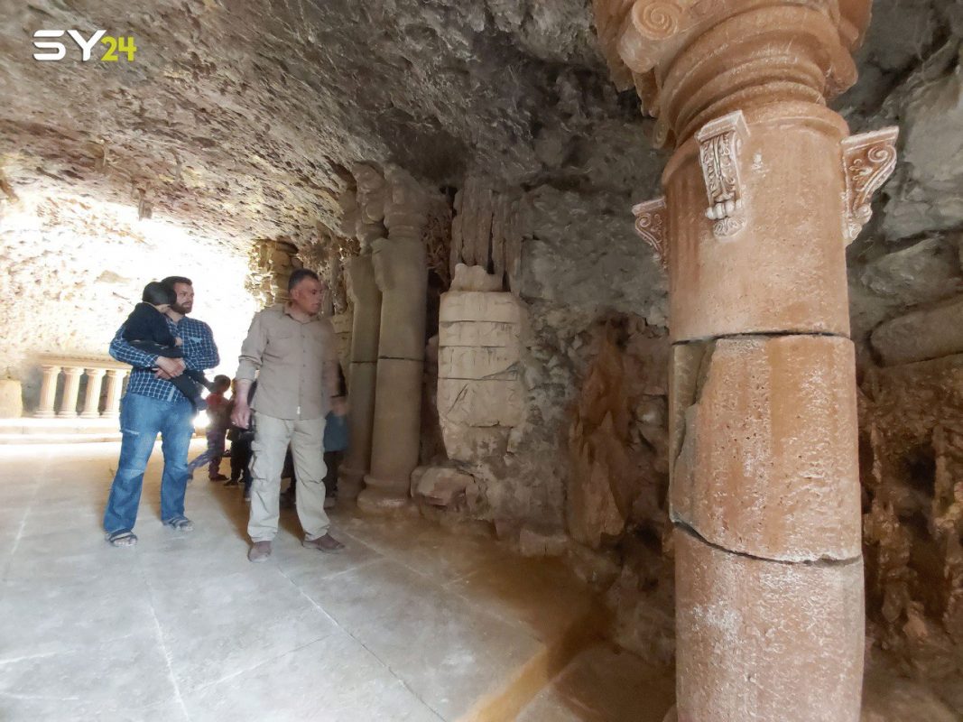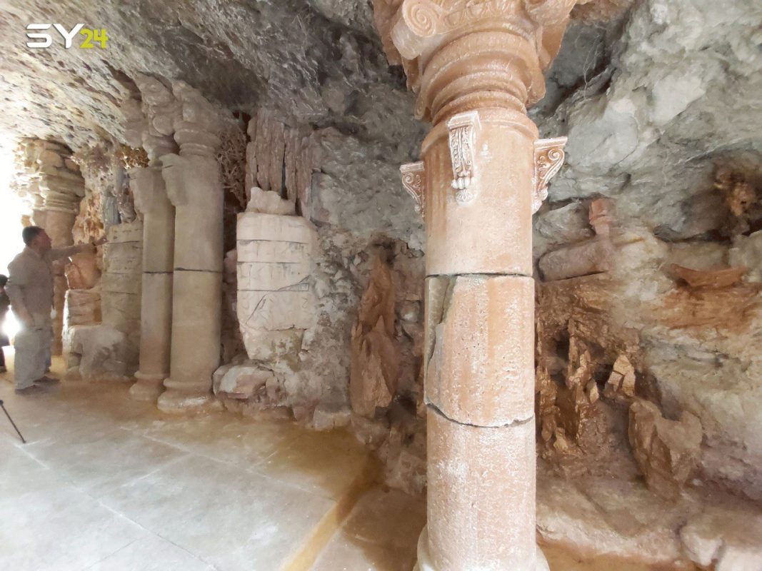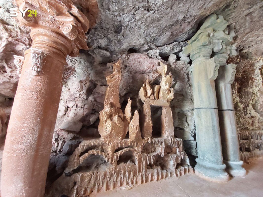 ورصدت عدستها أيضا النقوش الحجرية والأعمدة الموجودة داخل المغارة، إضافة إلى الكثير من التصاميم الأخرى التي تحاكي العصور الماضية.