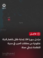مراسل سوريا 24: إصابة طفل بانفجار قنبلة عنقودية من مخلفات الحرب في مدينة اللطامنة شمالي حماة