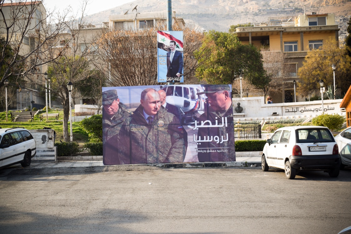 ضجت شوارع العاصمة دمشق بصور الرئيس الروسي “فلاديمير بوتين”، مرفقة بعبارات التضامن معه من قبل النظام السوري وأذرعه الاقتصادية والصناعية في حربه على أوكرانيا.