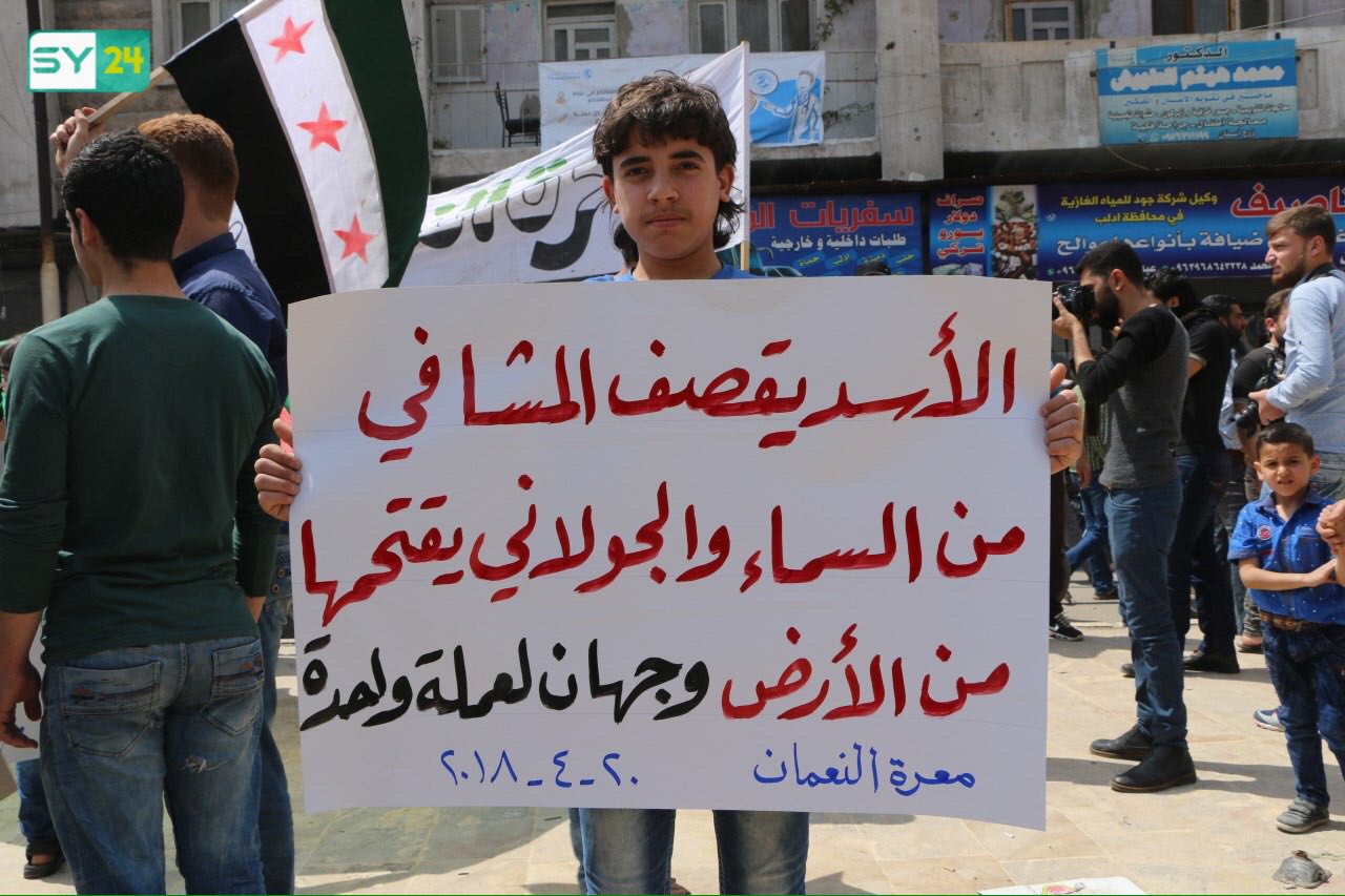 “الأسد يقصف المشافي من السماء والجولاني يقتحمها من الأرض”.. معرة النعمان تنتفض مجدداً خرج أهالي وناشطو مدينة معرة النعمان في ريف إدلب بوقفة سلمية احتجاجاً على سياسة هيئة تحرير الشام باقتحام المدن والبلدات الآهلة بالسكان واستخدامها القذائف المدفعية