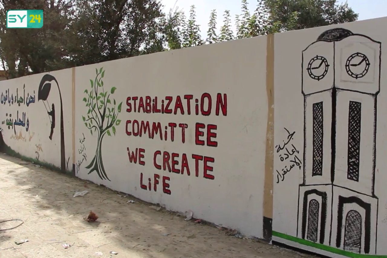 رسام يزين جدران مدينة جرابلس ويمحو السواد الذي خلفه تنظيم “داعش” قرر الشاب “محمد” المهجر من حي الوعر في حمص، منذ قرابة العامين، إخفاء ما تركه تنظيم الدولة “داعش” خلفه، من سواد على جدران مدينة جرابلس