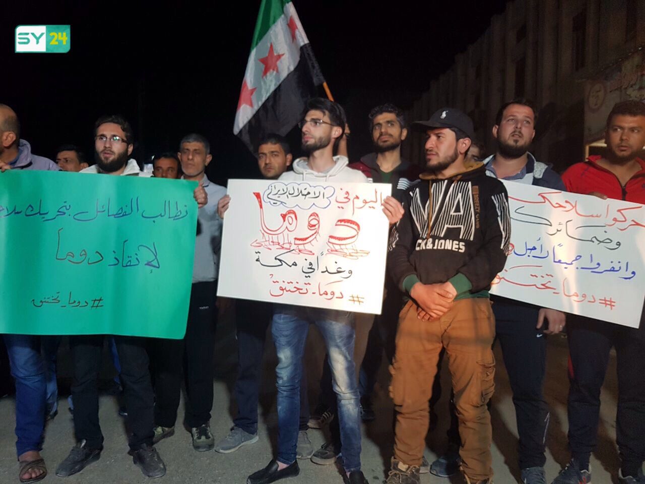 “دوما تختنق”.. وسم يشعل المظاهرات بعد مجزرة الأسد الكيماوية عقب ورود الخبر على مواقع التواصل الاجتماعي وتدفق الصور المروعة لضحايا مجزرة الكيماوي الجديدة التي ارتكبها النظام السوري في مدينة دوما؛ خرجت مظاهرة سلمية غاضبة