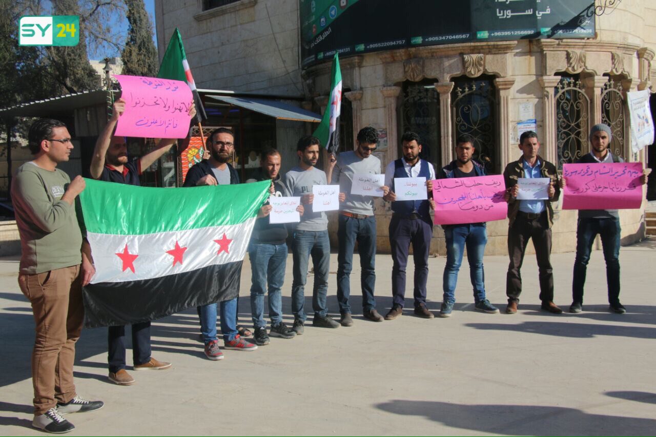 النظام يحتجز مهجري الغوطة الشرقية.. ومظاهرات من إعزاز: “بيوتنا بيوتكم” نظم عدد من أهالي وناشطي مدينة إعزاز بريف حلب الشمالي وقفة سلمية احتجاجاً على منع مرور أهالي الغوطة الشرقية إلى مدينة الباب بريف حلب الشرقي،