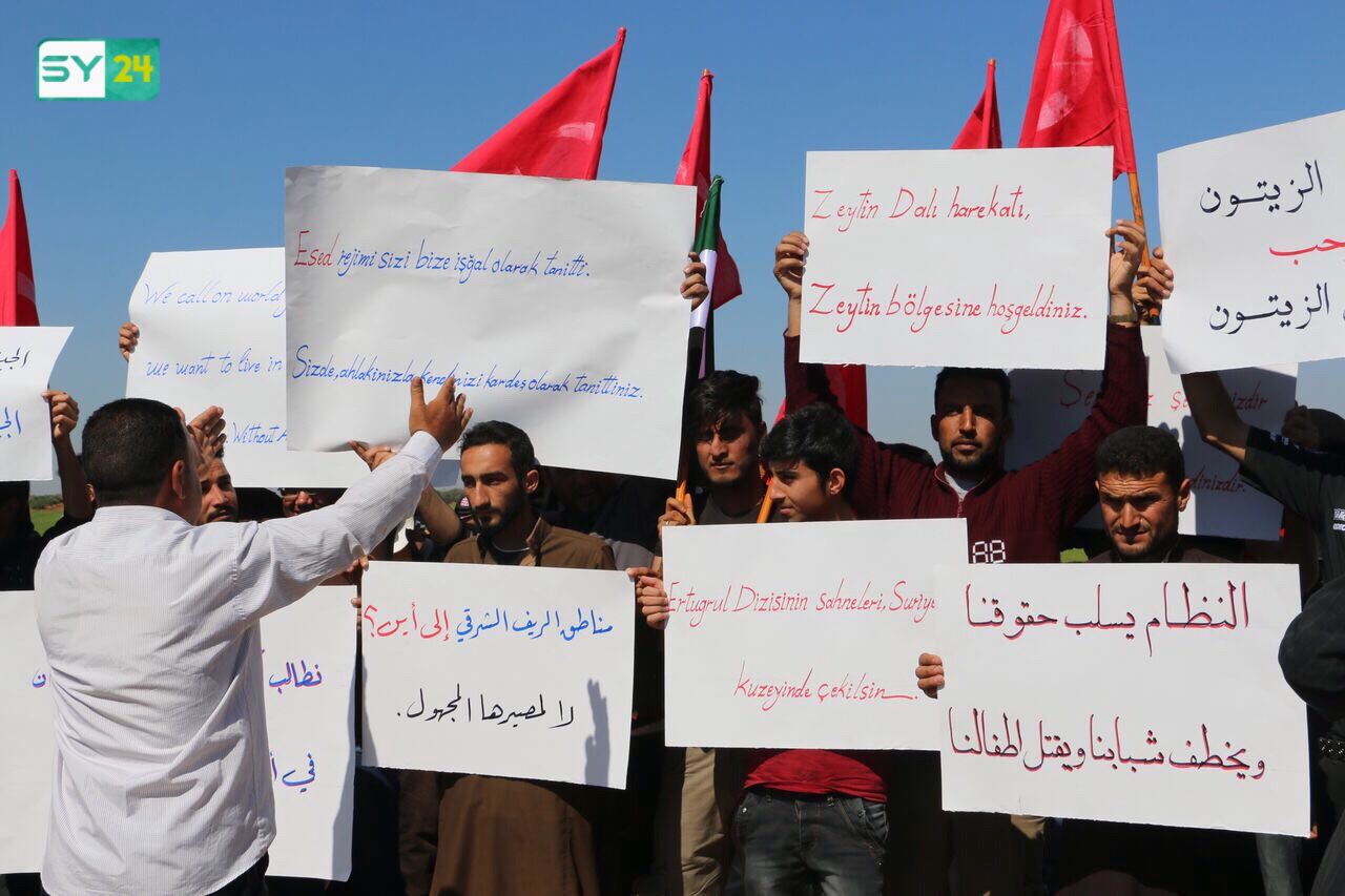 مظاهرة شعبية تطالب الحكومة التركية بإعادة المهجرين إلى منازلهم شرق إدلب خرج أبناء العشائر، يوم الاثنين (2 نيسان/أبريل)، في مظاهرة شعبية بالقرب من المنطقة التي تتمركز فيها القوات التركية في قرية الصرمان بريف معرة النعمان الشرقي.