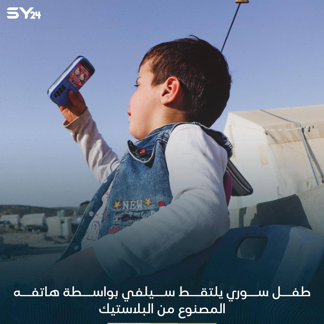 بهاتفه البلاستيك.. طفل يلتقط سيلفي مع خيام النازحين