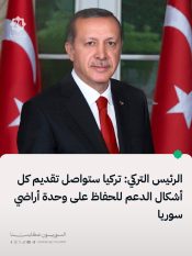 الرئيس التركي: تركيا ستواصل تقديم كل أشكال الدعم للحفاظ على وحدة أراضي سوريا