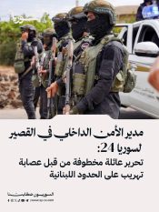 مدير الأمن الداخلي في القصير لسوريا 24: تحرير عائلة مخطوفة من قبل عصابة تهريب على الحدود اللبنانية 27/10/2025