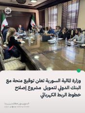 وزارة المالية السورية تعلن توقيع منحة مع البنك الدولي لتمويل مشروع إصلاح خطوط الربط الكهربائي 11/12/2025