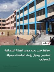 بدء العطلة الانتصافية للمدارس العامة والخاصة في مدينة حلب من يوم الأحد 11-1-2026 وحتى السبت 24-1-2026. 10/01/2026