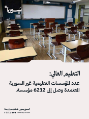 التعليم العالي: عدد المؤسسات التعليمية غير السورية المعتمدة وصل إلى 6212 مؤسسة.