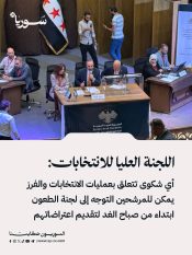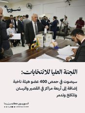 اللجنة العليا للانتخابات: سيصوت في حمص 400 عضو هيئة ناخبة إضافة إلى أربعة مراكز في القصير والرستن وتلكلخ وتدمر 06/10/2025