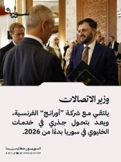 وزير الاتصالات يلتقي مع وفد من شركة “أورانج” الفرنسية، ويعد بتحول جذري في خدمات الاتصال الخليوي في سوريا بدءًا من مطلع 2026. 03/10/2025
