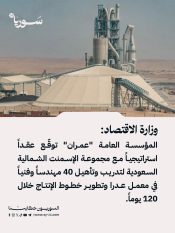 المؤسسة العامة “عمران” توقّع عقداً استراتيجياً مع مجموعة الإسمنت الشمالية السعودية لتدريب وتأهيل 40 مهندساً وفنياً في معمل عدرا وتطوير خطوط الإنتاج خلال 120 يوماً. 12/09/2025
