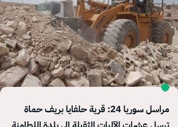 مراسل سوريا 24: قرية حلفايا بريف حماة ترسل عشرات الآليات الثقيلة إلى بلدة اللطامنة للمساهمة في إزالة الركام وفتح الطرقات