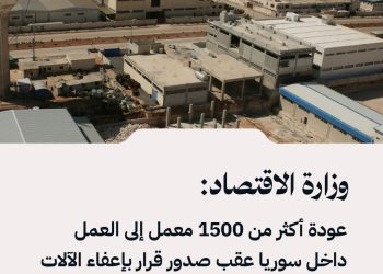 وزارة الاقتصاد: عودة أكثر من 1500 معمل إلى العمل داخل سوريا عقب صدور قرار بإعفاء الآلات الصناعية المستوردة من الرسوم الجمركية