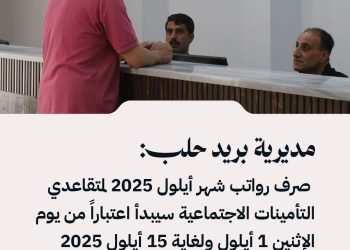 مديرية بريد حلب: صرف رواتب شهر أيلول 2025 لمتقاعدي التأمينات الاجتماعية سيبدأ اعتباراً من يوم الإثنين 1 أيلول ولغاية 15 أيلول 2025 وذلك في المراكز البريدية المعتمدة.