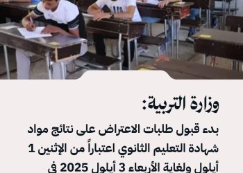 بدء قبول طلبات الاعتراض على نتائج مواد شهادة التعليم الثانوي اعتباراً من الإثنين 1 أيلول ولغاية الأربعاء 3 أيلول 2025 في مديريات التربية بالمحافظات